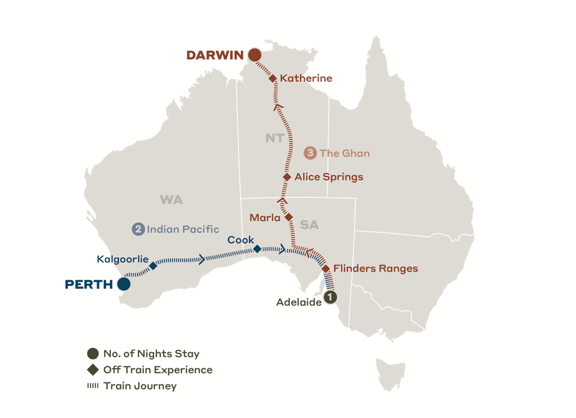 Across a blue coastline and through the Red Centre, the best way to experience the vast remoteness of Australia is by pairing a journey on the Indian Pacific with The Ghan. Departing Perth, you’ll cross the Nullarbor, travelling along the world’s longest stretch of straight railway track. You’ll stop overnight in Adelaide before boarding The Ghan heading towards your final destination, Darwin.