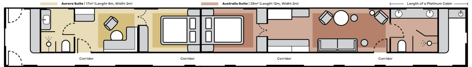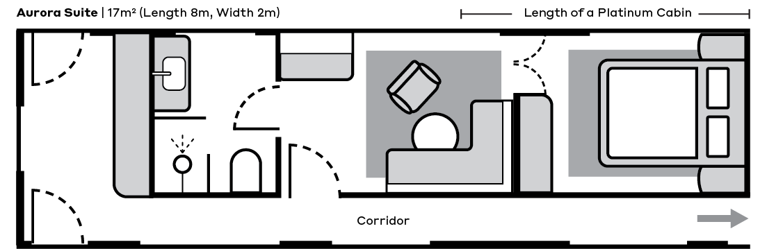 The Aurora Suite is double the size of a Platinum cabin and features a fixed queen-sized bed, lounge set and en suite with premium Jurlique amenities. You’ll also have a wardrobe and plenty of room to move throughout the Suite allowing for a luxurious stay. Additional features include:
