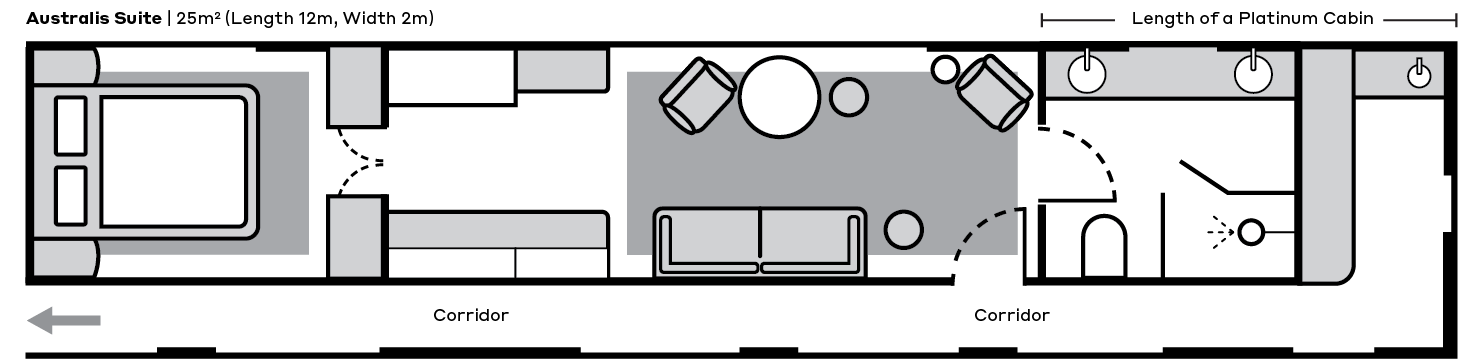 The Australis Suite is the most luxurious suite in Australian train travel. At three times the size of a Platinum cabin it features a separate bedroom with a fixed queen-sized bed, full lounge set, personal bar and en suite with double vanity and premium Jurlique amenities. This Suite also has a writing desk as well as a wardrobe and ample room to stretch your legs or host friends and family in-suite. Additional features include: