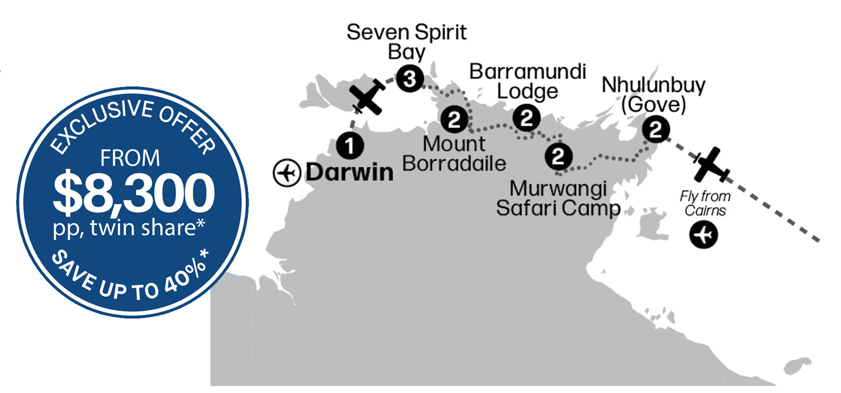 *Terms & Conditions apply. Advertised price is per person, twin share, travelling on select departures travelling between August and September 2025, with up to savings based on the difference between the Discover Arnhem Land offer and the Everyday Fare. Savings are per couple, twin share, based on travelling on 31 August 2025. Savings are reflected in the tour fare quoted and are subject to availability. Block out dates apply. Bookings must be made by 30 June 2025, unless allocation sold out prior. Offer valid on select itinerary departing 31 August 2025. Full payment required at time of booking. Amendments permitted up to 60 days prior to commencement of the tour and must be within the same travel period. Amendments requested between 60-99 days prior to commencement of tour will incur a fee of $250 per guest. Cancellations: 100% of the tour price. Prices correct as at 31 March 2025.