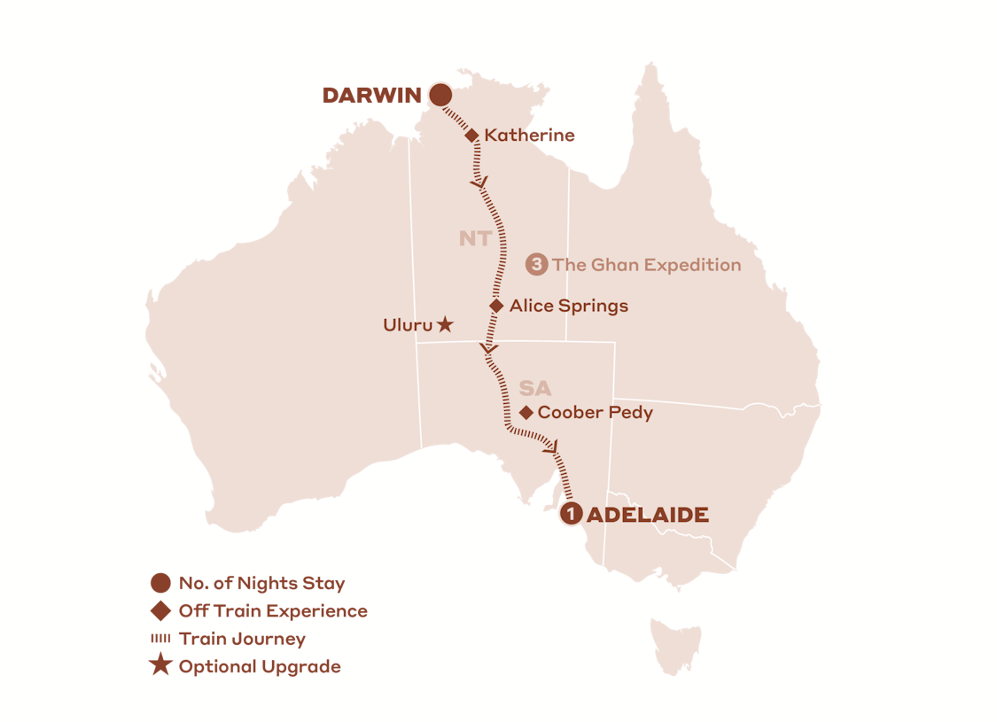 Travel through Australia’s Red Centre by train to make your way to Adelaide, South Australia’s food and wine capital. With the perfect combination of meals on and off the train, you’ll make the most of the gastronomic side of your rail journey, while also exploring the sights of Nitmiluk Gorge, Alice Springs and the unusual town of Coober Pedy. On arrival in Adelaide, enjoy a relaxing overnight stay to explore this vibrant city.