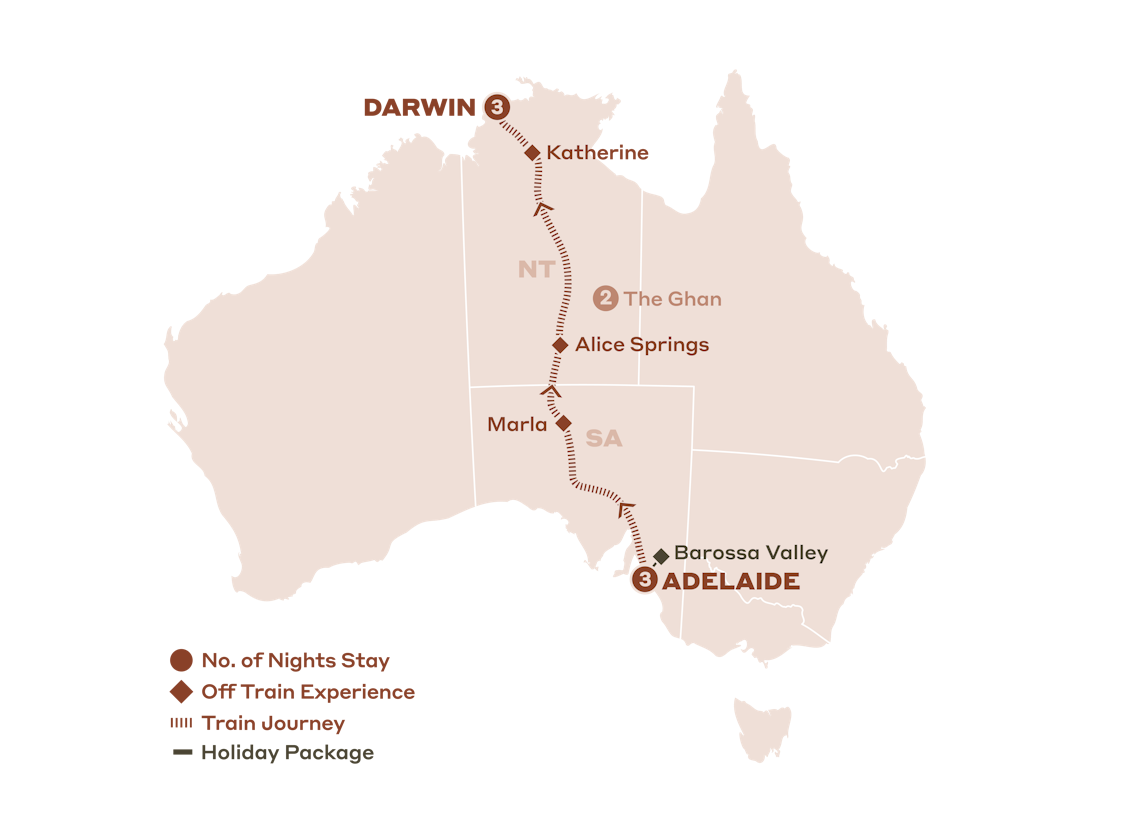 • 2 nights aboard The Ghan, Adelaide to Darwin, including all meals, beverages and Off Train Experiences in Marla, Alice Springs and Katherine