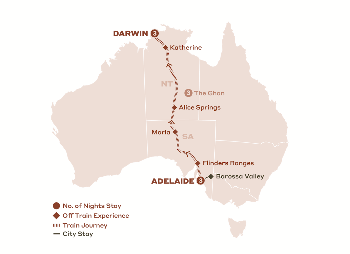 • 3 nights aboard The Ghan, Adelaide to Darwin, including all meals, beverages and Off Train Experiences in the Flinders Ranges, Marla, Alice Springs and Katherine