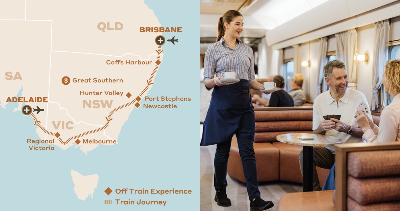 *Terms & conditions apply. The Great Southern Fly & Stay Free 2025-2026 special offer is valid for new bookings made between 1 June – 31 August 2025. Offer available for travel between 1 December 2025 – 28 February 2026, from Adelaide to Brisbane or vice versa. Advertised price is per person based on the Great Southern Fly & Stay Free 2025-2026 special offer fare in a Gold Single, Gold Twin, and Gold Premium Twin cabin, travelling in December 2025. Subject to availability. Block-out dates apply. Prices may vary. Special offer includes free return flights, plus one free night accommodation in Brisbane or Adelaide at a hotel of Journey Beyond’s choosing. Return economy airfares and taxes are valid up to the value of $750 AUD per person. Any additional flight costs will be at an additional expense. Flight offers are available from major capital cities including Sydney, Darwin, Melbourne, Adelaide, Brisbane, Perth, Hobart, or Canberra AU. All offers are subject to airline availability.