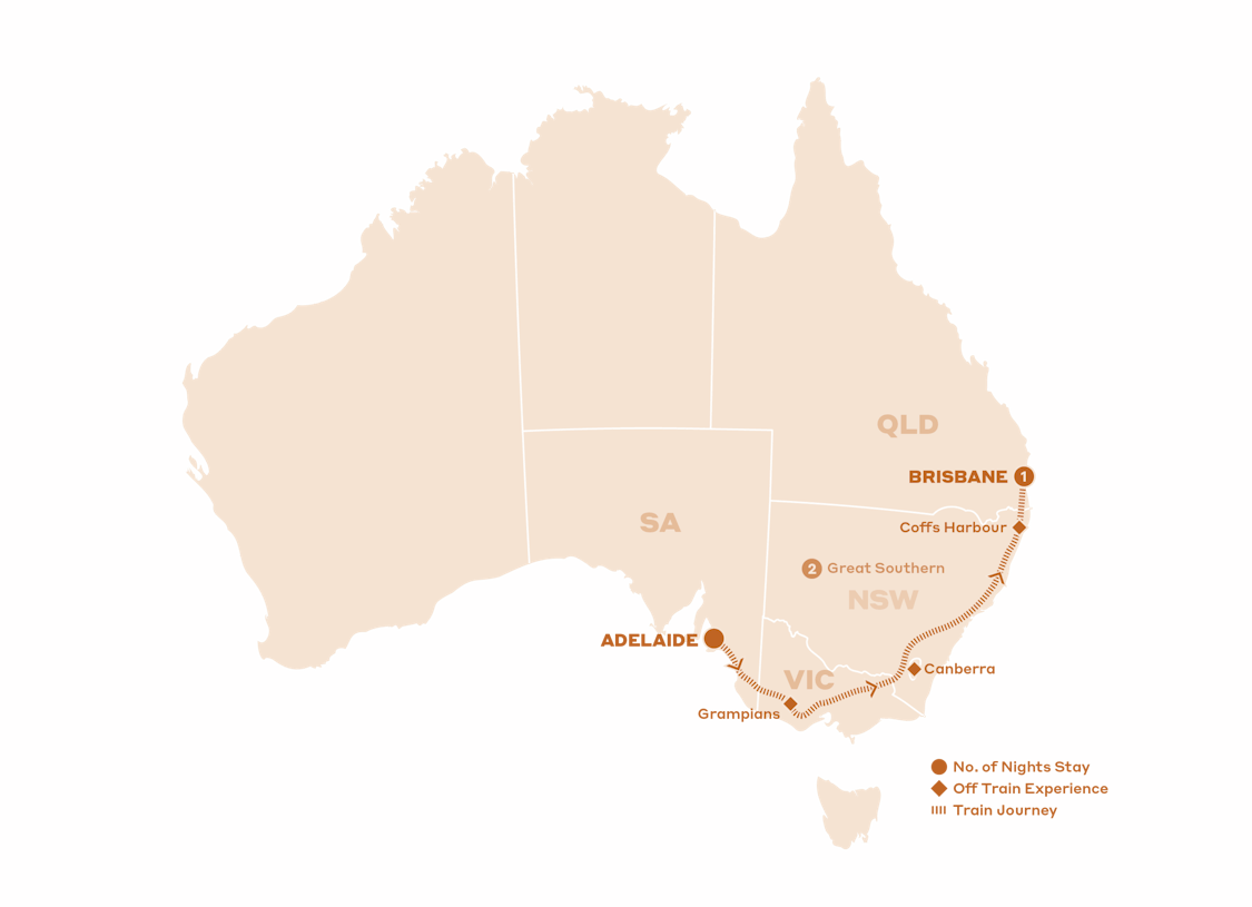 • 2 nights aboard the Great Southern, Adelaide to Brisbane, including all meals, beverages and Off Train Experiences in the Grampians, Canberra and Coffs Harbour