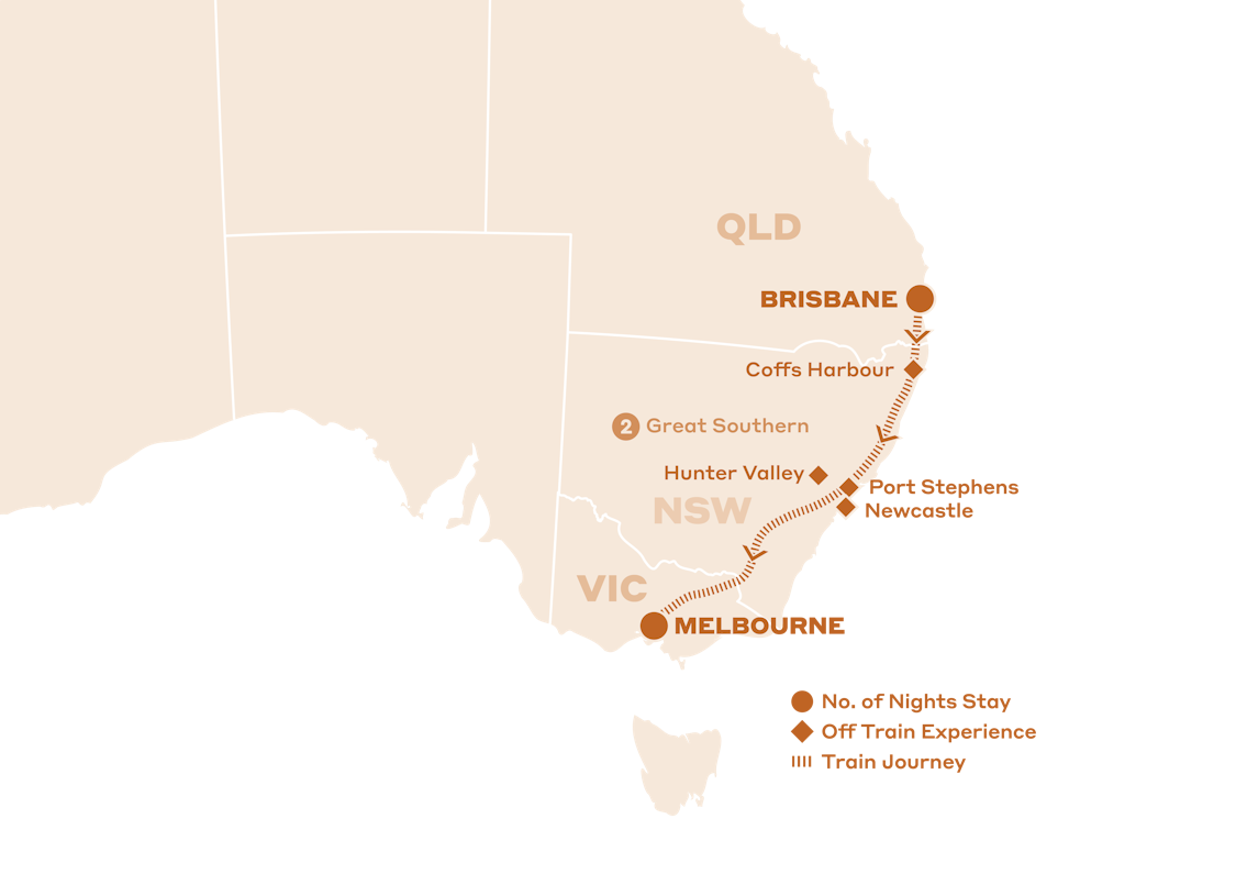 Summer deserves a celebration – and what better celebration than travelling the east coast of Australia by train? Departing Brisbane, the Great Southern takes you south into the rolling hills of New South Wales before stopping for a signature beachside dining experience in Coffs Harbour. You’ll have time to meander through the historic vineyards of the Hunter Valley or explore beautiful Port Stephens by land or sea, before heading towards Victoria and ending your journey with a day of activities in Melbourne.