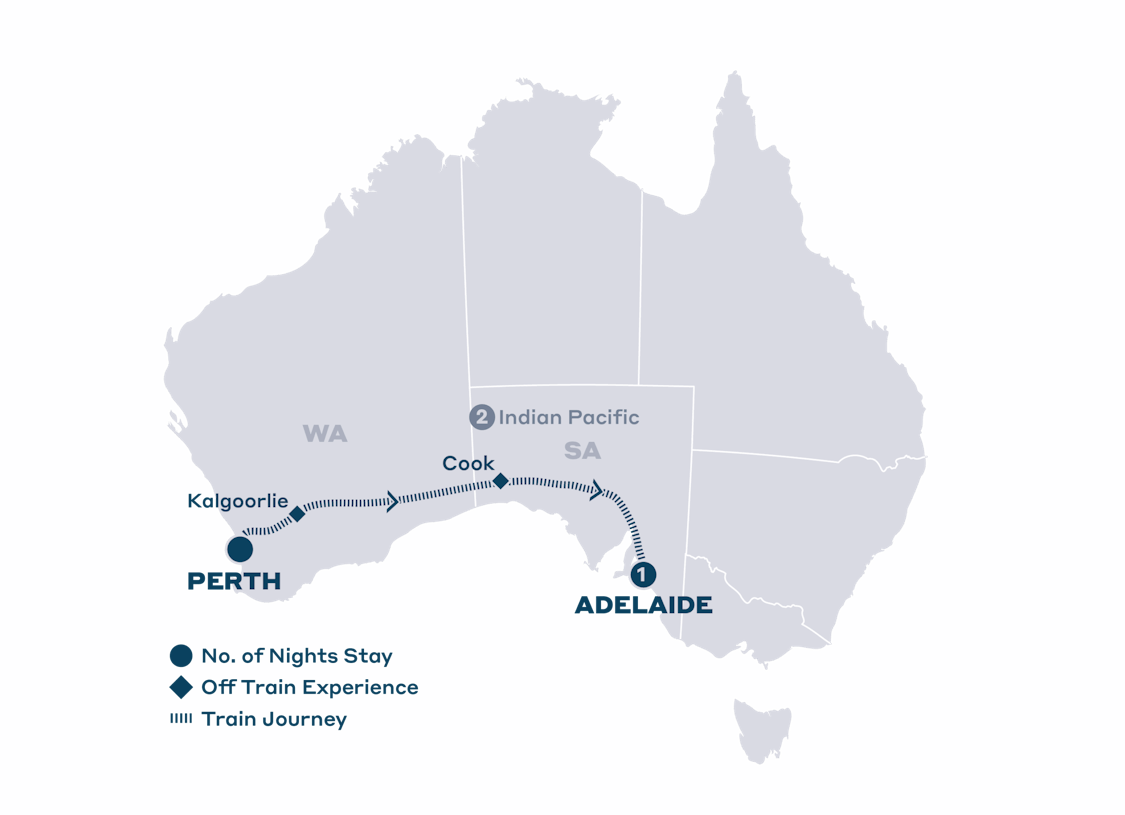 • 2 nights aboard the Indian Pacific, Perth to Adelaide, including all meals, beverages and Off Train Experiences in Kalgoorlie and Cook