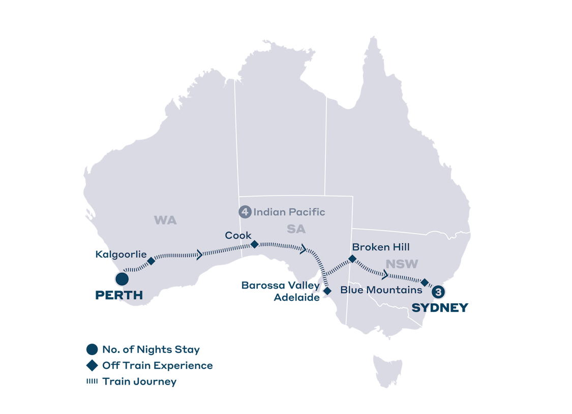 • 4 nights aboard the Indian Pacific, Perth to Sydney, including all meals, beverages and Off Train Experiences in Kalgoorlie, Rawlinna, Cook, Adelaide, and Blue Mountains