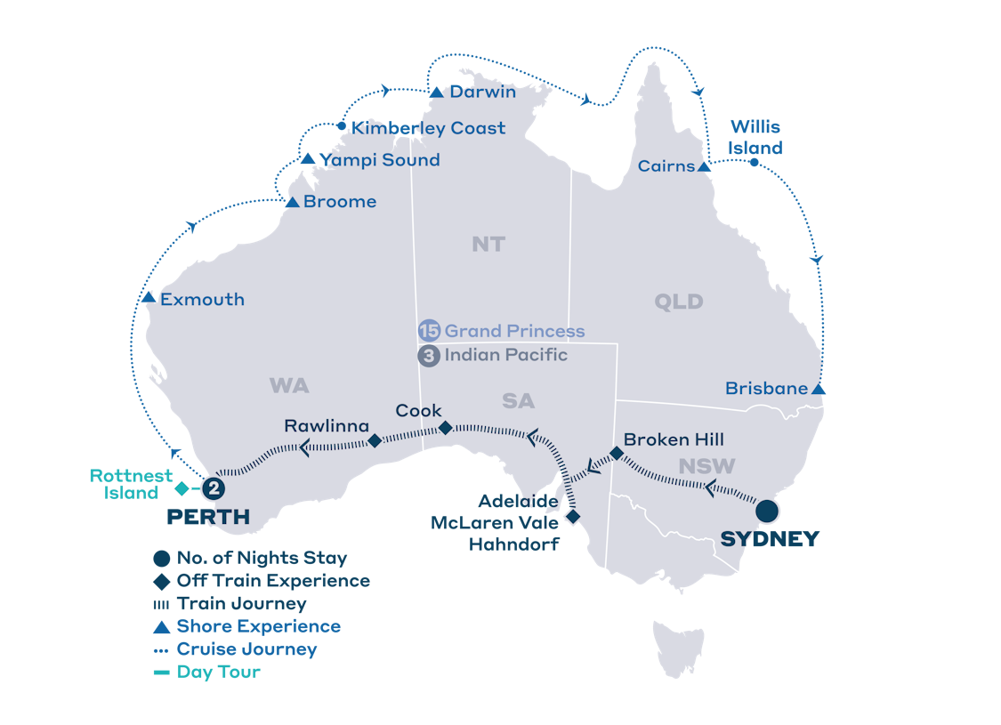 Covering a large swathe of Australia, this incredible rail and sail adventure takes you from coast to coast and back again, through spectacular natural landscapes, where you’ll have opportunities for deeper exploration through a range of day-trip activities and Off Train Experiences. This is a journey of contrasts, with spectacular coastlines, pristine beaches, and the vast expanse of the Nullarbor Plain, demonstrating Australia’s diverse landscapes.