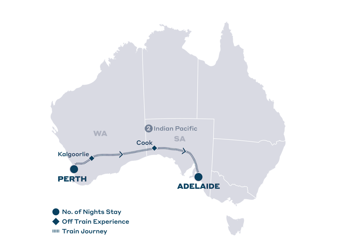 • 3 days / 2 nights aboard the Indian Pacific, travelling from Perth to Adelaide