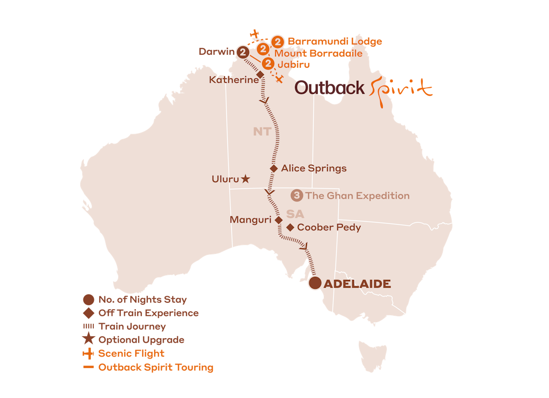 Discover a sacred and mystical land in northern Australia on this extraordinary small-group journey through the heart of Arnhem Land and Kakadu National Park. Immerse yourself in the world’s oldest surviving culture, meet the wildlife, and find tranquility in natural sites crafted by time. Then, sit back and settle into The Ghan’s gentle rhythm as you travel through the breathtaking arid beauty of the outback from Darwin to Adelaide.