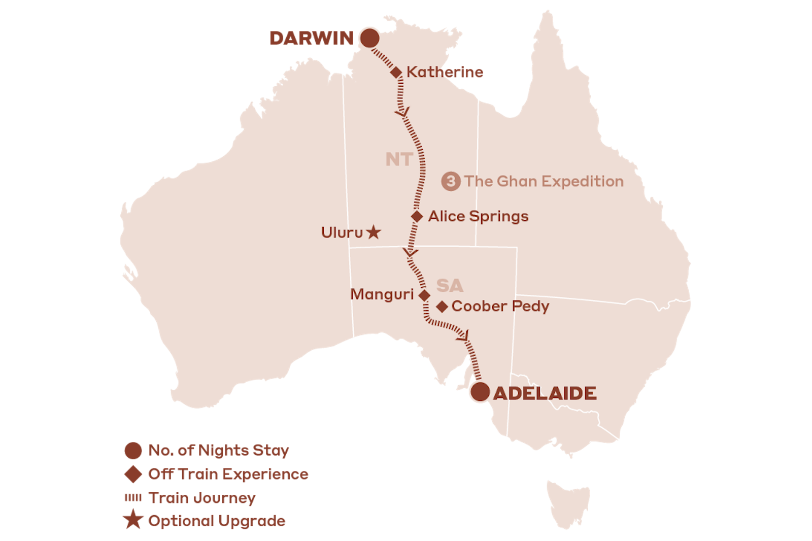 An icon of Australian rail travel and one of the world’s great train journeys, ride the rails of history aboard The Ghan Expedition between Darwin and Adelaide.